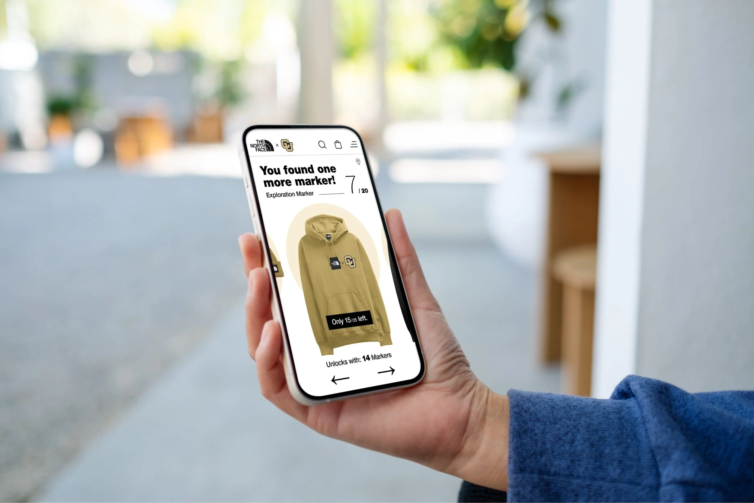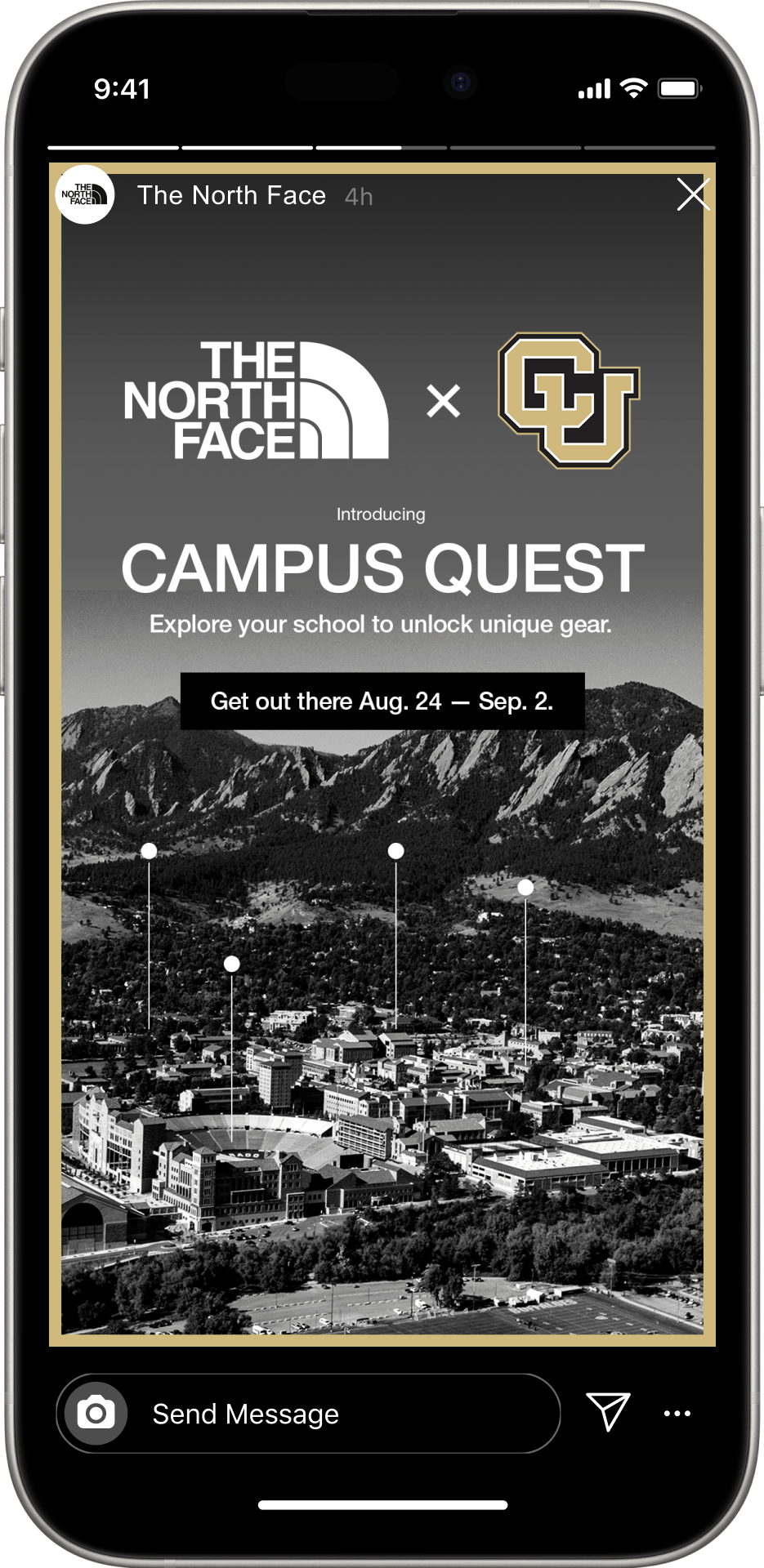 We’ll create excitement for the quest through targeted social media and on-campus ads that will give the rules and hype up the potential branded gear. After they’ve completed the quest, they’ll get a prompt to go to the TNF Boulder location to pick up what they’ve won.