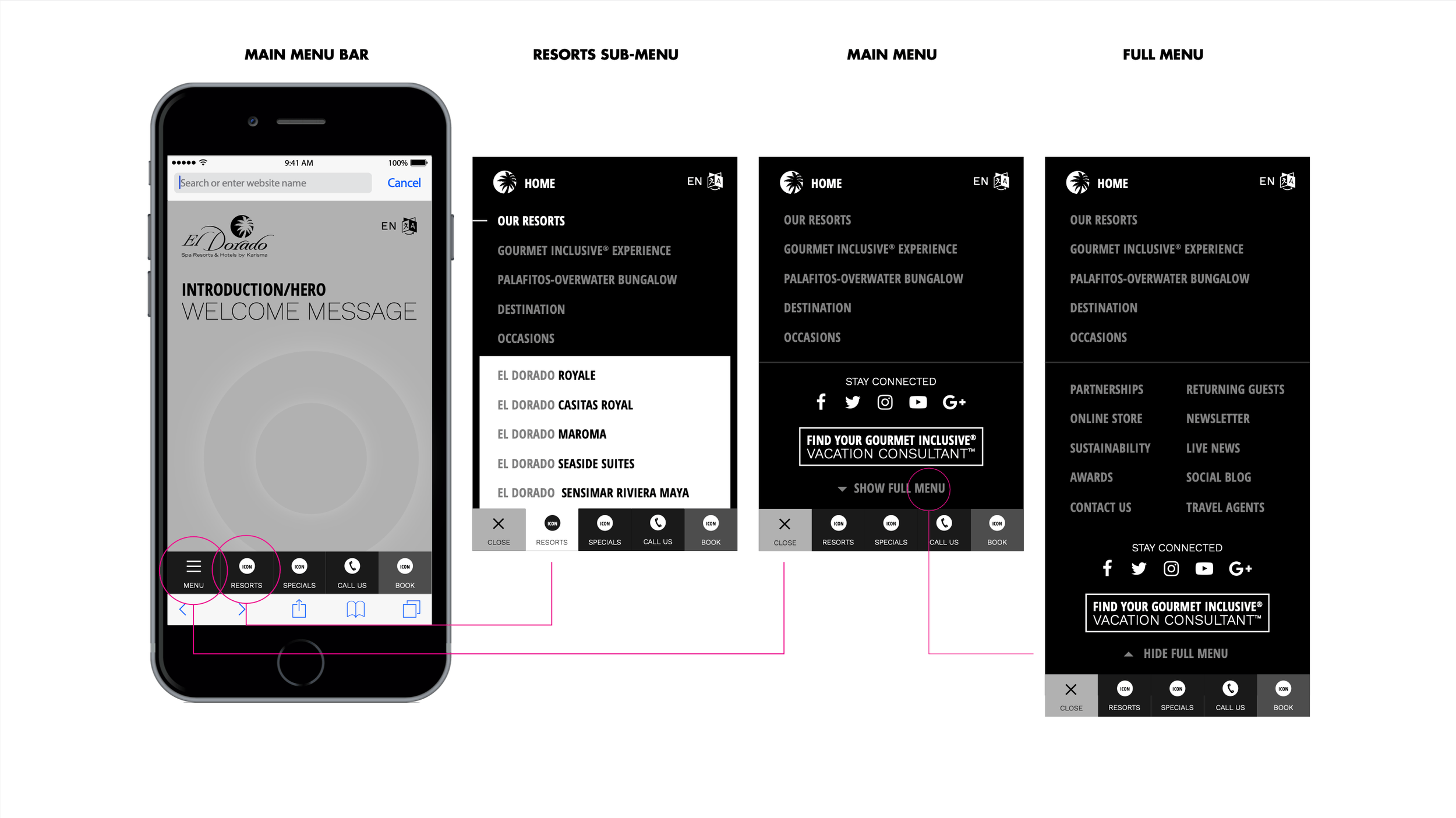 A dual-purpose menu system. Functioning as both a portal for seamless inter-resort discovery and an intuitive navigational tool within each individual resort site, providing clarity and ease for all users.