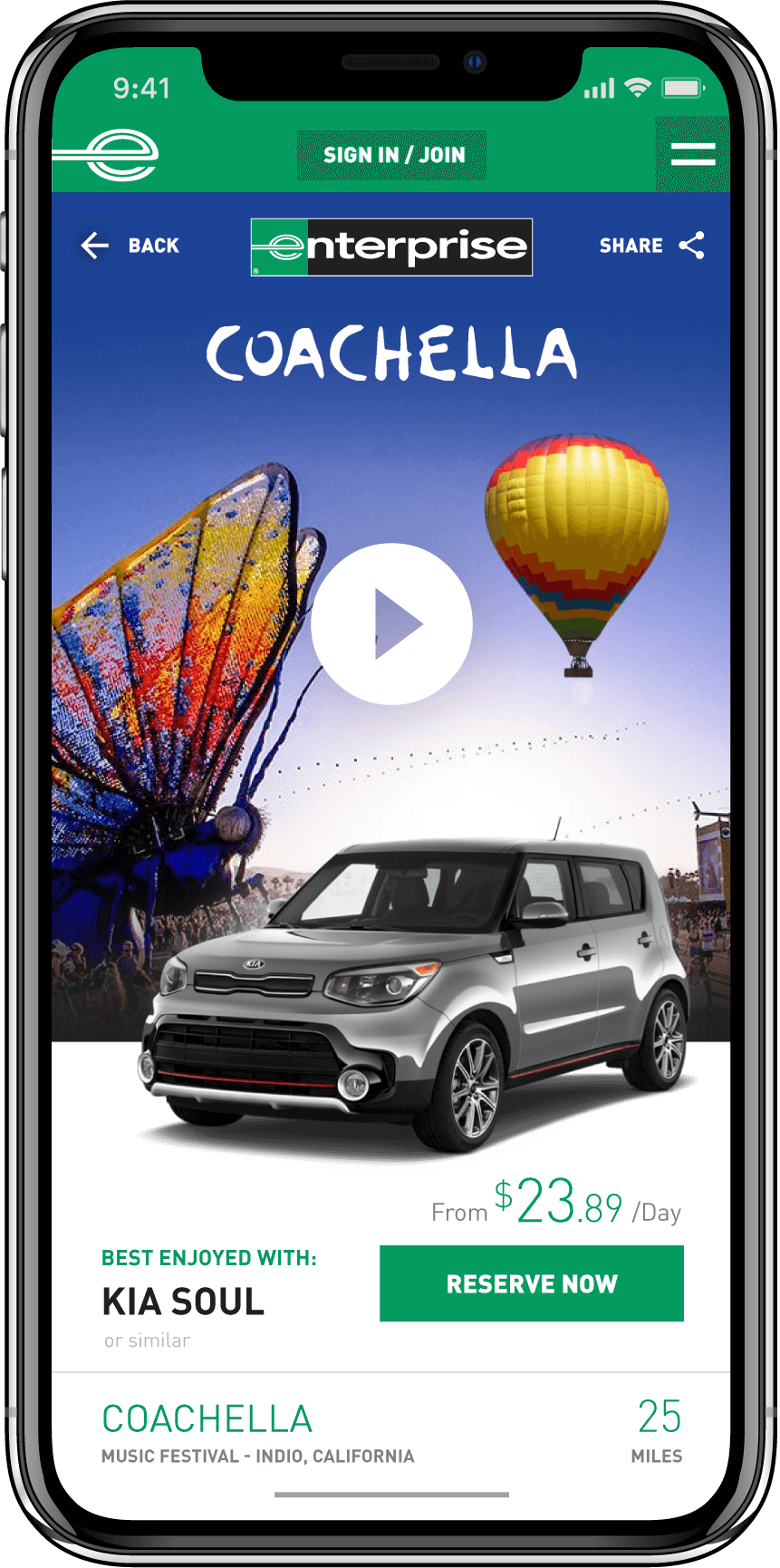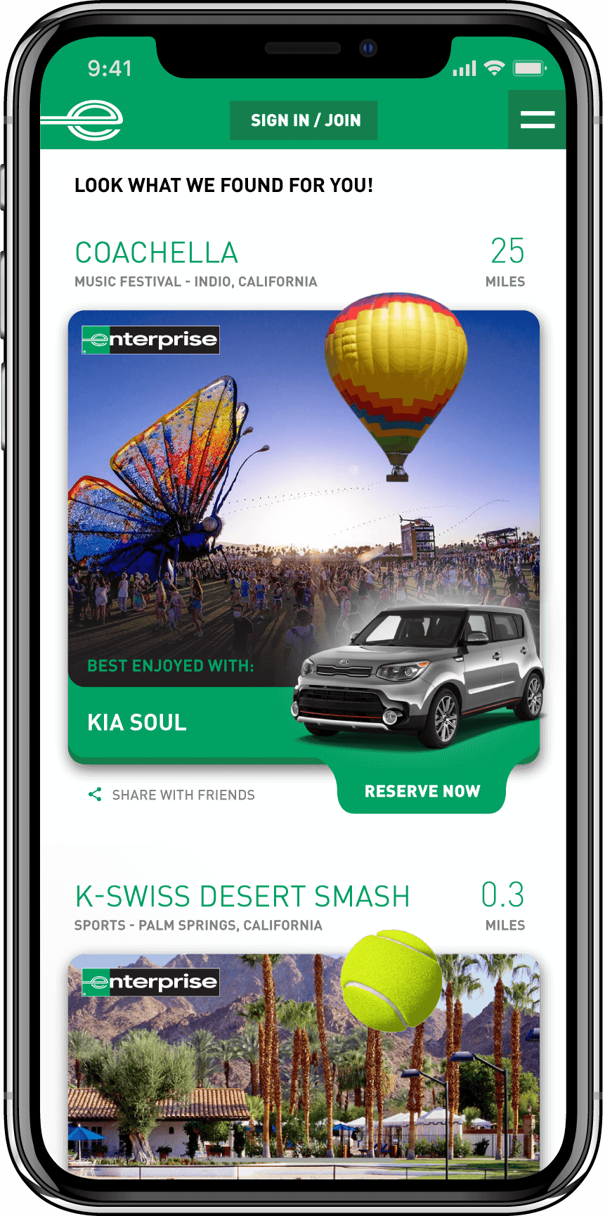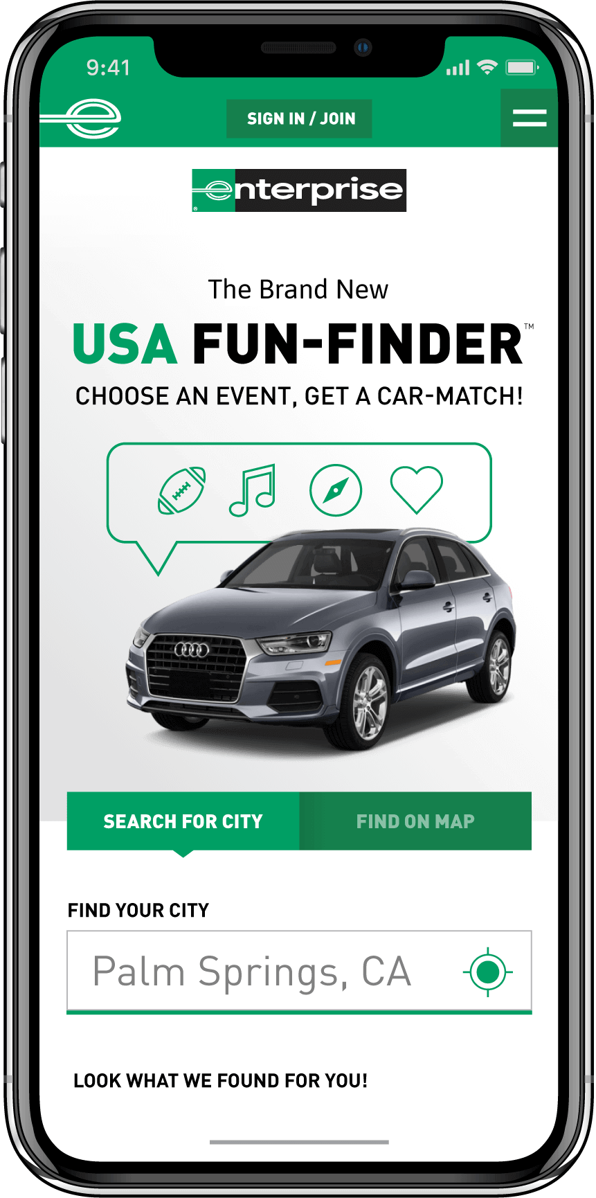 The app concept is tied to a social activation idea to create a platform for people to discover events, concerts, sports games, or sights, and then recommend the perfect Enterprise car to go enjoy them with.