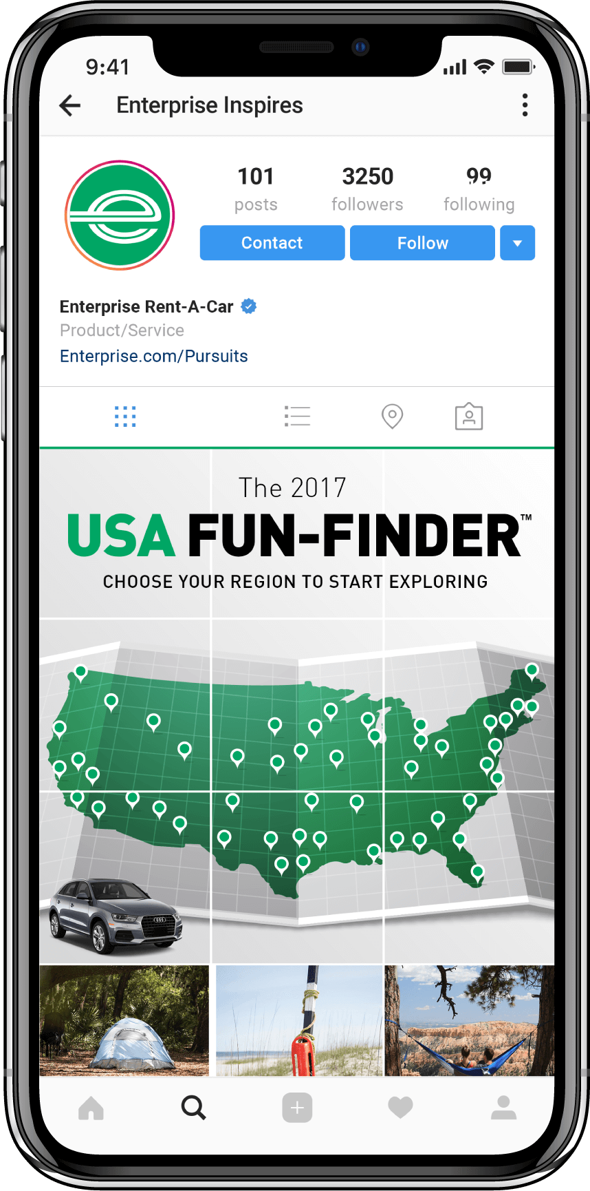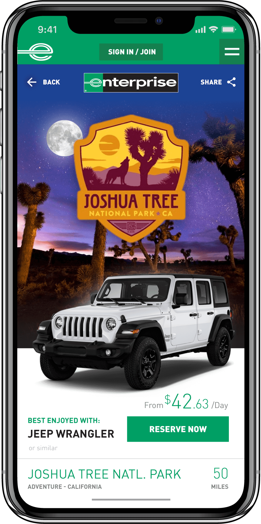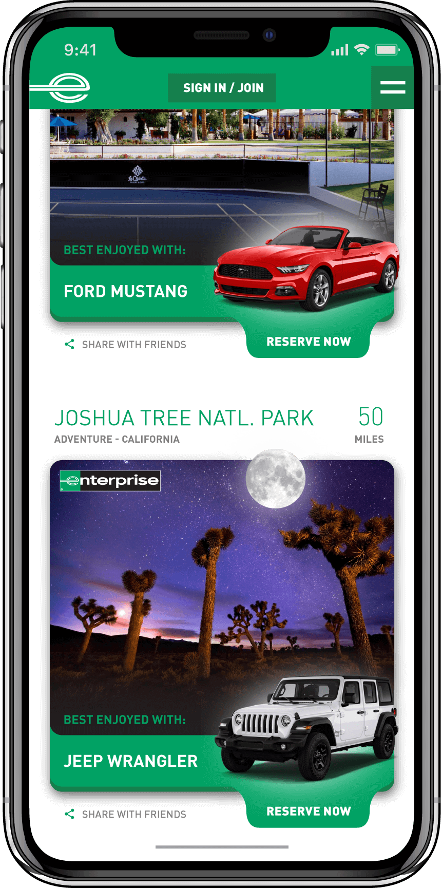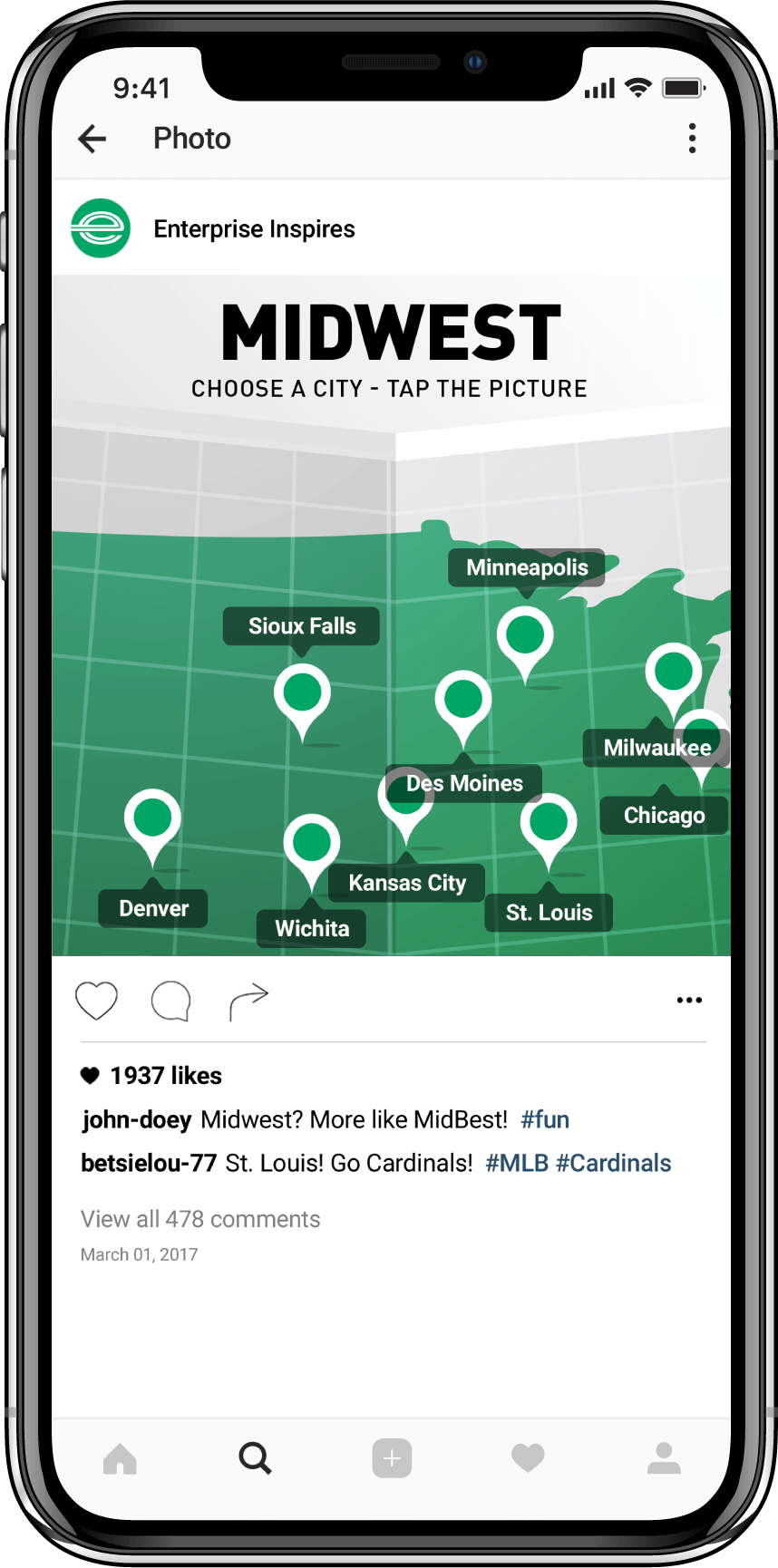 The app concept is tied to a social activation idea to create a platform for people to discover events, concerts, sports games, or sights, and then recommend the perfect Enterprise car to go enjoy them with.